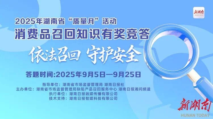 當下,消費市場持續繁榮,消費品質量安全已成為社會各界關注的焦點。在2025年湖南省“質量月”活動啟動之際,9月5日,省市場監督管理局攜手湖南日報社精心策劃并推出消費品召回知識有獎競答活動——不僅能學安全消費干貨,還能抽最高88元現金紅包,每日3次答題機會,輕松參與贏福利! 一、活動時間:20天參與期,紅包抽不停 2025年9月5日至9月25日,20天時間,每天都能來答題抽紅包,碎片時間就能參與! 二、參與方式:3種入口任選,直達答題頁