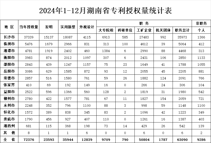 2024年1-12月湖南省專利授權量統計表