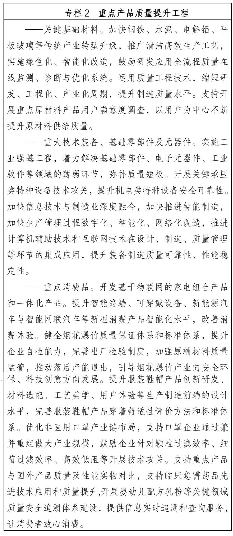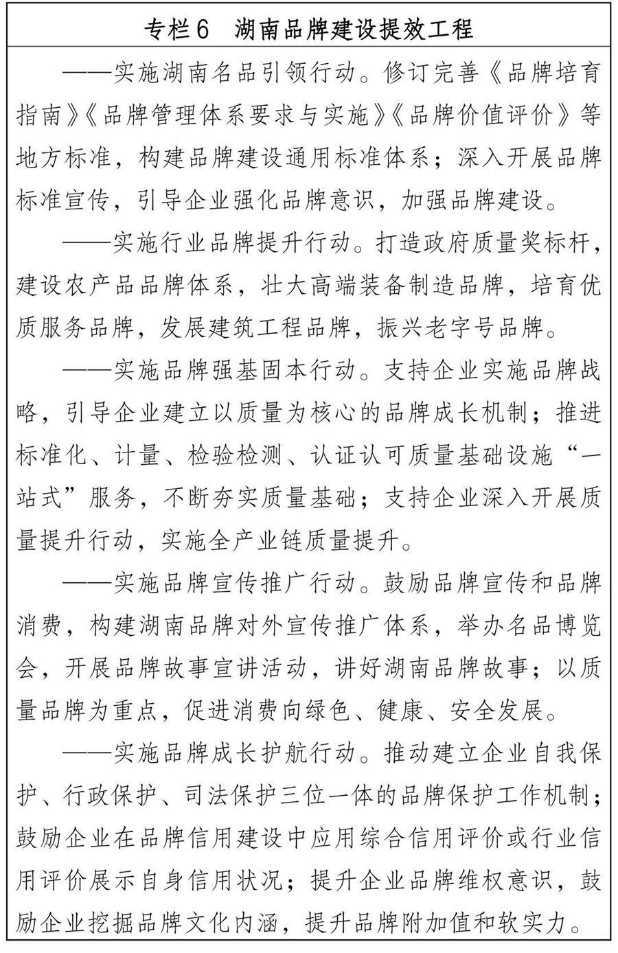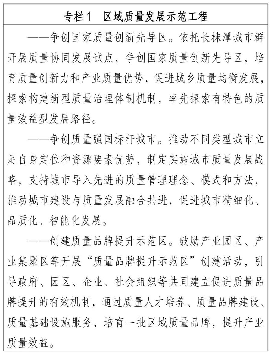湖南省質量強省建設綱要 為深入貫徹落實《質量強國建設綱要》,全面推進質量強省建設,切實提高我省質量總體水平,制定本綱要。 一、指導思想 以習近平新時代中國特色社會主義思想為指導,全面貫徹黨的二十大精神,堅持穩中求進工作總基調,立足新發展階段,完整、準確、全面貫徹新發展理念,服務和融入新發展格局,加強全面質量管理,促進質量變革創新,著力提升產品、工程、服務、環境質量,著力推動品牌建設,著力增強產業質量競爭力,著力提高經濟發展質量效益,著力提高全民質量素養,積極對接國際先進技術、規則、標準,緊緊圍繞質量安全和科技創新,夯實質量基礎,優化質量供給,全方位建設質量強省,不斷增強人民群眾的質量獲得感幸福感安全感,為全面落實“三高四新”戰略定位和使命任務、全面建設社會主義現代化新湖南提供質量支撐。 二、主要目標 到2025年,質量強省戰略全面推進,質量總體水平全面提高,“質量第一”“以質取勝”理念牢固樹立,品牌影響力穩步提升,質量管理全面加強,先進質量文化普遍弘揚,經濟發展質量效益明顯提升,質量共治格局基本形成。 ——產業質量競爭力不斷增強。一二三產業質量效益和競爭力穩步提高,農業標準化生產普及率穩步提升,制造業質量競爭力明顯增強,服務業供給有效滿足產業轉型升級和居民消費升級需要,建設現代化產業體系,培育一批品牌形象突出、質量水平一流、具有湖南特色的現代企業。 ——產品、工程、服務、環境質量水平顯著提升。農產品質量安全例行監測合格率和食品抽檢合格率均達到98%以上,制造業產品質量合格率達到94%以上,工程質量抽查符合率不斷提高,消費品質量合格率有效支撐高品質生活需要,服務質量滿意度全面提升,全省主要污染物減排達到國家統一分解目標,全省環境空氣質量優良天數比例達到91.8%以上,地表水達到或優于III類水質斷面比例達到95%以上。 ——品牌建設取得明顯成效。品牌培育、保護機制更加健全,品牌價值和效益持續提升,培育一批質量水平高、影響力大的知名品牌,在工業強基、智能制造、綠色制造、專精特新、制造+互聯網+服務、高端裝備等領域樹立一批具有高質量水平的標桿企業。 ——質量治理體系更趨成熟。質量主體責任有效落實,政策引導、質量考核、技術法規、基礎支撐體系基本建立。質量安全監管科學廉潔高效,質量安全風險整體可控,重點消費品質量安全狀況持續改善,進出口商品質量穩步提升,重、特大質量安全事故得到有效防范。 到2035年,質量強省建設基礎更加穩固,質量和品牌競爭力顯著提升,質量對經濟高質量發展貢獻率全面提高,人民群眾質量獲得感持續增強。 三、重點任務 (一)提高質量發展效益 1.提升制造業質量競爭力。聚焦打造國家重要先進制造業高地,完善產業鏈標準體系、質量管理體系。發揮產業集群龍頭企業帶動作用,引導集群內企業標準協調、創新協同、業務協作、資源共享。開展材料質量提升關鍵共性技術研發和應用驗證,提高材料質量穩定性、一致性、適用性水平。改進基礎零部件與元器件性能指標,提升可靠性、耐久性、先進性。推進基礎制造工藝與質量管理、數字智能、網絡技術深度融合,提高生產制造敏捷度和精益性。支持通用基礎軟件、工業軟件、平臺軟件、應用軟件工程化開發,實現工業質量分析與控制軟件關鍵技術突破。推動產業質量升級,加強產業鏈全面質量管理,著力提升關鍵環節、關鍵領域質量管控水平。 2.增強質量發展創新動能。聚焦打造具有核心競爭力的科技創新高地,加快發展數字經濟,促進數字經濟和實體經濟深度融合,實施質量管理數字化賦能行動,推動質量策劃、質量控制、質量保證、質量改進等全流程信息化、網絡化、智能化轉型。加強質量管理信息化建設,大力開發在線檢測、過程控制、質量追溯等質量管理工具;加強質量數據分析,推動企業建立以數字化、網絡化、智能化為基礎的全過程質量管理體系。加強專利、商標、版權、地理標志、植物新品種、集成電路布圖設計等知識產權保護,提升知識產權公共服務能力。 3.提升質量發展開放水平。聚焦打造內陸地區改革開放高地,主動對接長江經濟帶發展、粵港澳大灣區建設、長三角區域一體化發展等國家戰略,以高水平開放推動形成湖南質量發展新優勢、新格局。依托湖南湘江新區、中國(湖南)自由貿易試驗區、長株潭國家自主創新示范區以及國家級園區等平臺,培育形成質量卓越產業集群。健全質量開放合作互助機制,推動市州用好用活質量政策,將質量發展與生產力布局、區位優勢、環境承載能力及社會發展需求良性融合,引導長株潭國家自主創新示范區重點布局高新技術產業和生產性服務業,支持大湘西地區全面對接國家產業調整轉移,推進產業結構提質升級。加強質量理論和技術方法跨區域合作交流,共享質量理論和技術研究成果。 (二)增加優質產品供給 4.筑牢農產品食品藥品質量安全防線。強化農產品質量安全保障,健全鄉鎮網格化管理體系,加快推進市縣農產品質檢機構資質認證,填平補齊鄉鎮農獸藥殘留快速檢測設備缺口,強化農產品質量安全產地檢測。實施產地環境凈化和農藥獸藥使用減量行動,推進農業區域公用品牌、地方特色品牌建設,開展現代農業全產業鏈標準化試點,大力
